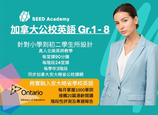 以加拿大安大略省教育廳規範的課綱為基礎 ,SEED Academy研發出適齡適性的多元學習課件內容 。透過文法練習及文學分析 ,分階段規劃學生在英文應用上的原創寫作 、標準口語和思維模式培訓 。由具安省教師資格證的老師 ,以及名牌大學助教共同指導的公校課程 ,能最大程度激發學生的知識潛力與學習興趣 ,為後續的留學或升學目標做足準備 。
